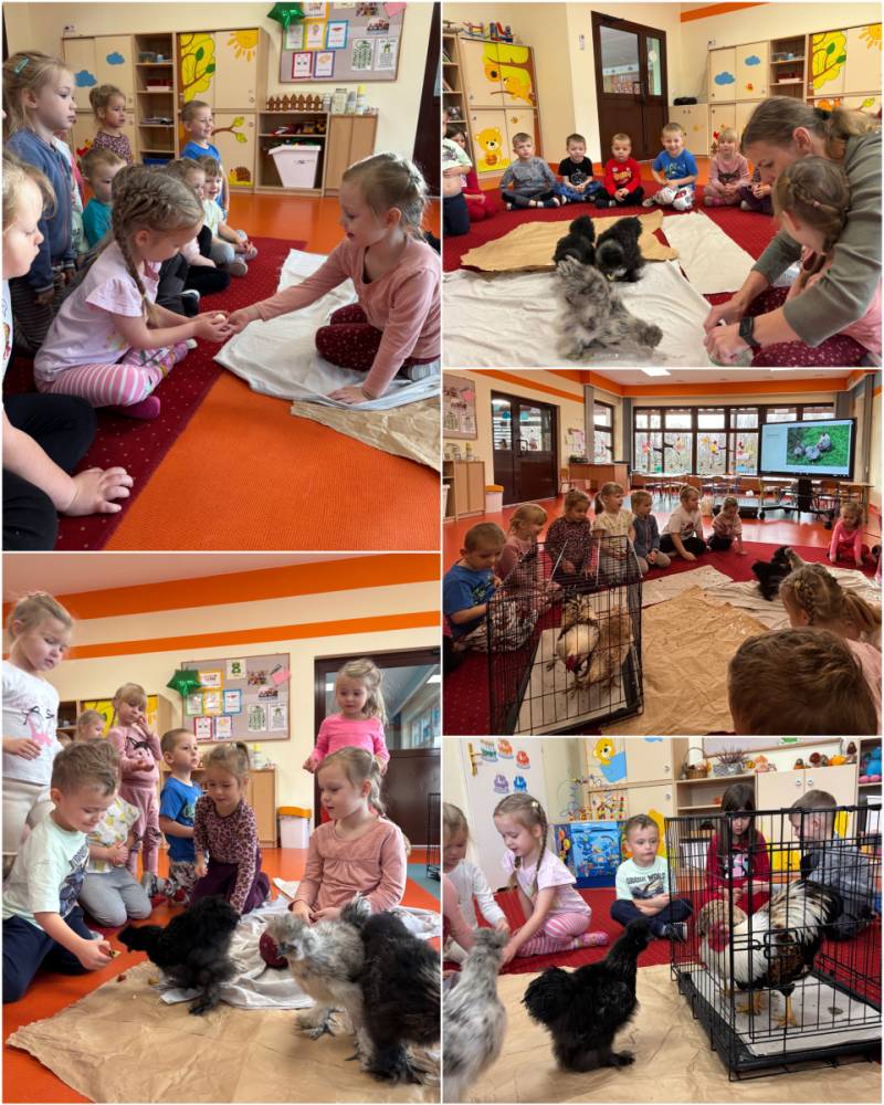 Żabki odwiedzili wyjątkowi goście: mama i siostra Oliwki. Zabrały ze sobą piękne, puchate kurki silki, które hodują. Dzieci poznały wiele ciekawostek na temat tych zwierząt, mogły pogłaskać i nakarmić kurki. Przedszkolaki były zachwycone spotkaniem :)
