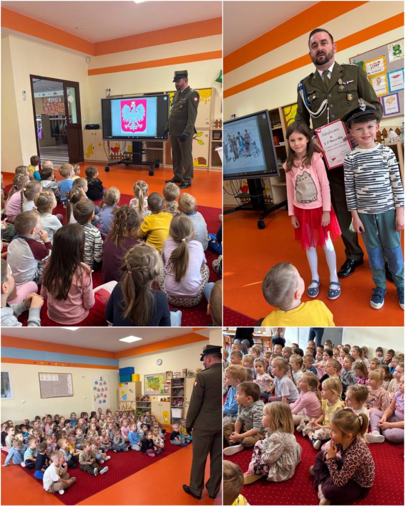 12 listopada nasze przedszkole odwiedził tata Agatki, który z zawodu jest żołnierzem. Pan Marcin przypomniał przedszkolakom symbole narodowe oraz opowiedział o siłach zbrojnych RP. Dzieci zobaczyły prezentację, z której dowiedziały się jak na przestrzeni wieków zmieniała się obronność. Przedszkolaki słuchały bardzo zainteresowane, a za wizytę podziękowały patriotyczną piosenką.
