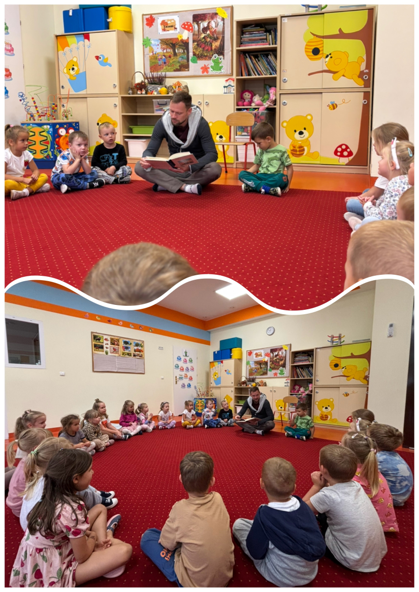 W środę 24 września Pan Tomek, tata Lilki z grupy Żabki, odwiedził nasze przedszkole i przeczytał wzruszającą książkę pt. "Aksamitny królik" Margery Williams. Dzieci słuchały z dużym zainteresowaniem. Dziękujemy za wizytę i zapraszamy chętnych rodziców, dziadków lub rodzeństwo do udziału w akcji Cała Polska Czyta Dzieciom!