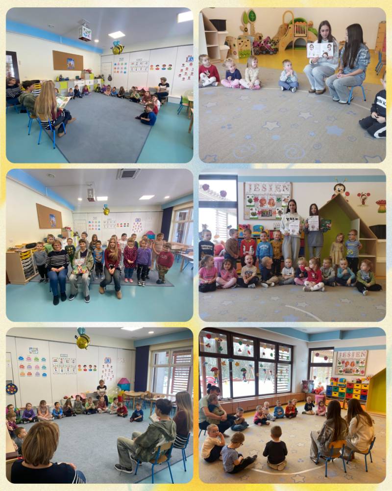 24 listopada dzieci z grupy ,,Pszczółki" oraz ,,Biedronki" odwiedzili wyjątkowi goście. Grupa uczniów ze Szkoły Podstawowej w Sośnicowicach w trakcie spotkania z przedszkolakami przeczytała dwie bajki - w grupie ,,Biedroneczek" była to ,,Jadzia Pętelka piecze pierniki", z kolei ,,Pszczółki" wysłuchały książeczki pt. ,,Cii..Cichutko!", która pokazuje, jak przyjaźń i troska o innych dodają pewności siebie i odwagi.